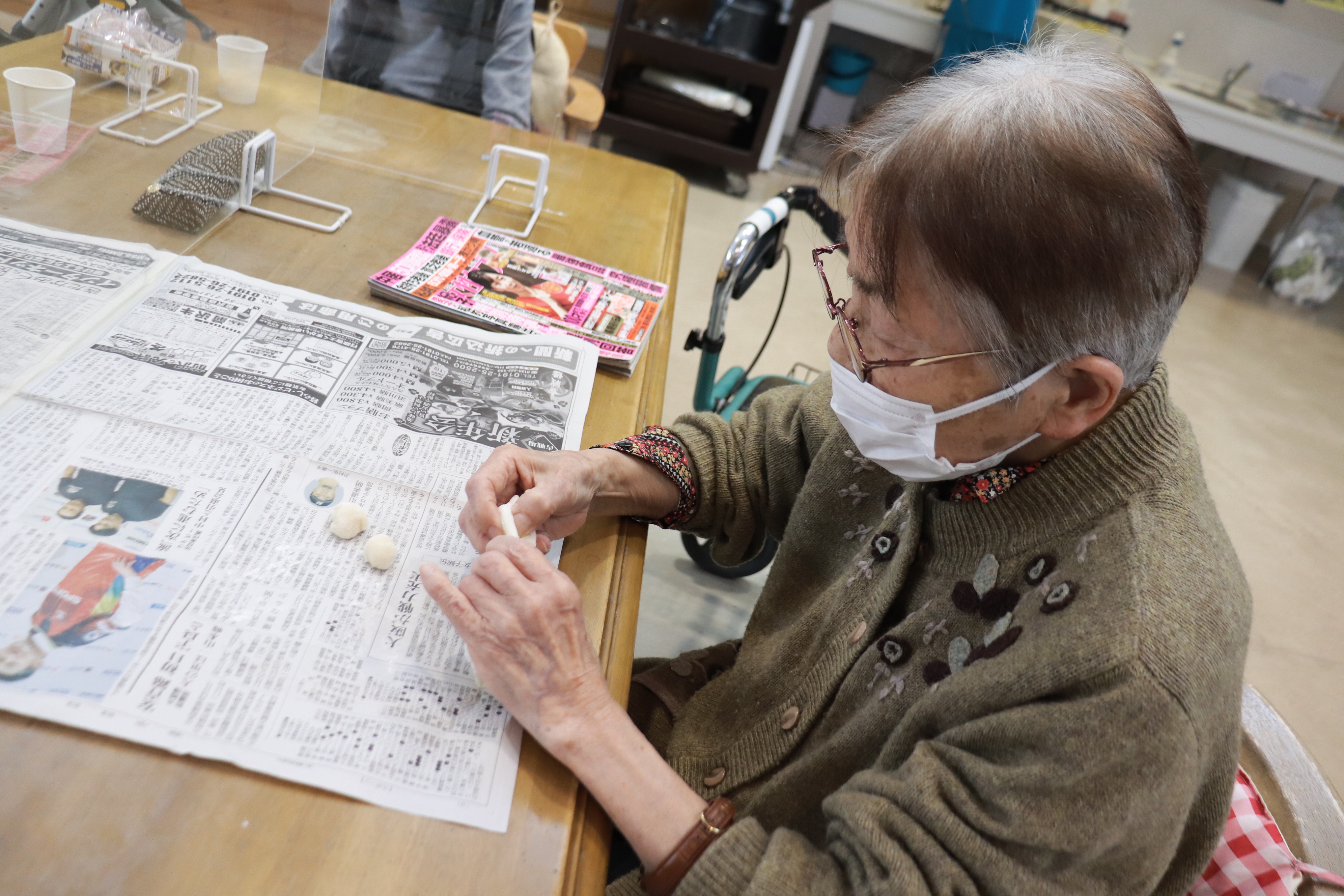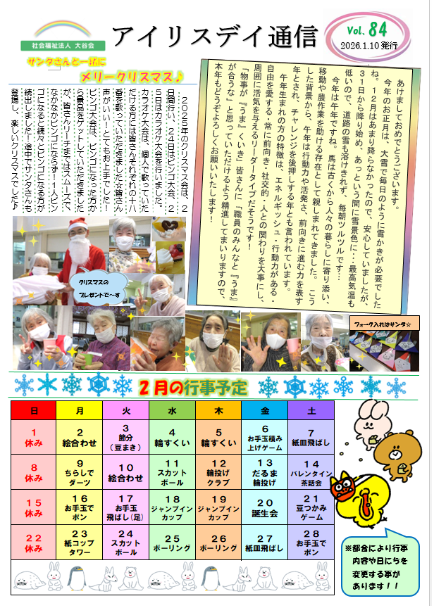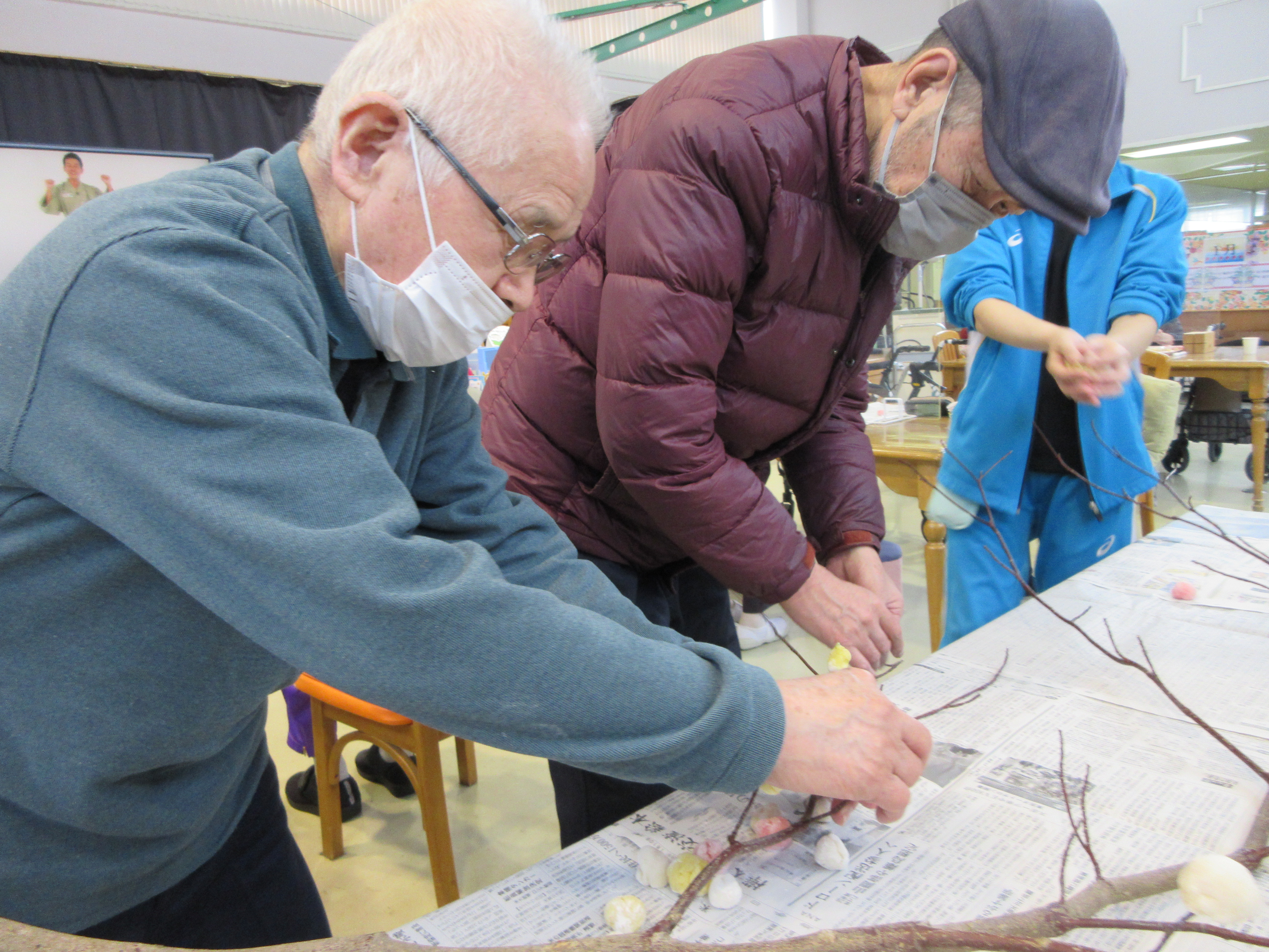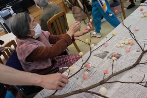 2026.01.22 お知らせ みずき団子作り+デイ通信♪ 1月14日にみずき団子作りを行いました! 職員が色をつけて捏ねた団子を 小さくちぎって 丸めていただき みずきの木に つけていただきました! 団子は4色あり 隙間がないくらい全面につけていただきました! 完成~☆ おやつはあずきひっつみでした♪ ひっつみが食べられない方には ソフトのものが提供されました♪ そして今月のデイ通信です☆
